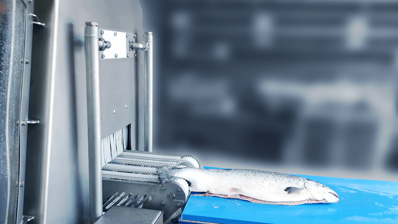 The fish is fed into the descaler and kept in place by side guides and upper and lower belts. Flat air nozzles remove the scales and mucus from the fish. No water is circulated during the process, resulting in a low bacterial cleaning process.